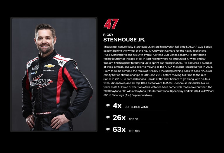 Hyak Motorsports is an American Professional stock car racing team that currently competes in the NASCAR Cup Series. The team is owned by Gordon Smith, Mark Hughes, NASCAR professional Ernie Cope along with former NBA All-Star center Brad Daugherty. The team currently has a technical alliance with Hendrick Motorsports and is housed in a 130,000 square foot facility in Harrisburg, NC. Hyak currently fields the No. 47 Chevrolet full-time in the NASCAR Cup Series with driver Ricky Stenhouse Jr.